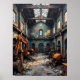 Dieses Bild zeigt das riesige, veraltete Innere eines verlassenen Lagers oder einer verlassenen Fabrik. Die Wände sind mit Schälfarbe und einer chaotischen Farbmischung (blau, orange und gelb) versehen. Große, rostige Industriemaschinen und Schutt sind über den Boden verstreut, ein Flickenteppich aus zerrissenem Papier und Farbe. Das Kunstwerk hat eine schwere impasto-Textur, die der Szene ein Gefühl des Zerfalls und reiche Geschichte verleiht.