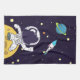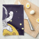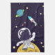 Handtuch mit dunkelblauem Hintergrund mit gelben Sternen, die überall verteilt sind. Obergeschichtet ist eine Abbildung eines Raumfahrers, der einen Anzug des Astronauten trägt, der über dem Mond schweben lässt. In der Ferne ist ein Planet mit Ringen und einem Raketenschiff, das in den Himmel fliegt und nach neuen Welten sucht, die es zu erforschen gilt.