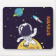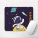 Ein personalisiertes Mousepad mit dunkelblauem Hintergrund und gelben Sternen verstreut. Obergeschichtet ist eine Abbildung eines Raumfahrers, der einen Anzug des Astronauten trägt, der über dem Mond schweben lässt. In der Ferne ist ein Planet mit Ringen und einem Raketenschiff, das in den Himmel fliegt und nach neuen Welten sucht, die es zu erforschen gilt.