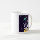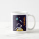 ein personalisierter Schlamm mit dunkelblauem Hintergrund und gelben Sternen. Obergeschichtet ist eine Abbildung eines Raumfahrers, der einen Anzug des Astronauten trägt, der über dem Mond schweben lässt. In der Ferne ist ein Planet mit Ringen und einem Raketenschiff, das in den Himmel fliegt und nach neuen Welten sucht, die es zu erforschen gilt.