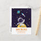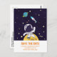 Save the Date Postkarte mit dunkelblauem Hintergrund mit gelben Sternen verstreut. Obergeschichtet ist eine Abbildung eines Raumfahrers, der einen Anzug des Astronauten trägt, der über dem Mond schweben lässt. Hallo, wenn er den Weltraum erforscht. In der Ferne ist ein Planet mit Ringen und einem Raketenschiff, das in den Weltraum abfliegt.