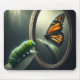 Eine grüne Raupe und ein farbenfroher Monarchen-Schmetterling stehen auf der gegenüberliegenden Seite eines ovalen Spiegels mit Wassertropfen auf der Oberfläche