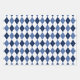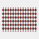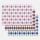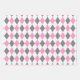 Set aus drei geometrischen Geschenkpapier-Verpackungsmustern mit rosa, grau und weiß; rot, schwarz und weiß; hellblau und dunkelweiß-weiße Raute mit karierten Mustern mit grauem "Nähen", diagonal über die Diamantformen - von katz_d_zynes