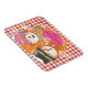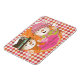 Unsere Raute Snowmen Holiday personalisierte Flexi-Magnet verfügt über ein Schneepaar in Oberhut, Winterhut, gestreiftem Schal und Karottennasen auf einem Hintergrund aus orangefarbenen, roten, rosa und weißen Raute, kleine Polka Punkte auf Orange mit Schneeflocken aus Weiß und ein rosa Banner, das Sie leicht mit einem Namen oder anderen Text personalisieren können.