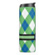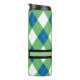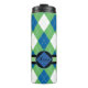 Mit Monogramm blaues und grünes Raute Muster Lasse Ihre Tasse so einzigartig wie Ihre Getränkespezialität! Die doppelwandige Konstruktion des Schuster behalte Ihnen warme Getränke und coole Getränke kalt, während Sie gleichzeitig Ihre Hände bequem behalten haben. Der flache Deckel schnappt fest zu, um Verschüttungen zu verhindern und der gepolsterte Boden gibt zusätzlich Haftung, sodass du sicher trinken kannst.