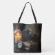 Raven in der Bibliothek Tote Bag. © Dunkles Herz Wünsche. Auf einigen Büchern steht ein Raven mit einer Kerze und einer Taschenuhr in der Nähe.
