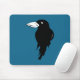 Bild einer schwarzen Krähe mit einem großen weißen Schnabel. Es scheint über etwas zu lächeln. Blauer Hintergrund.