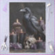 Ein Rabe auf einem menschlichen Schädel, umgeben von glühenden Kerzen und Amethystkristallen.