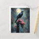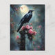 Auf einem moosbedeckten Grabstein, umgeben von blühenden rosa Rosen, steht ein beeindruckender Rabe, während der Vollmond die ruhige, mystische Szene erhellt.
