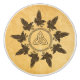 Neun belebte Schluchten (Corvus corax) kreisen um einen knotted Norse/Celtic Ring. In der Mitte erscheint ein Dreieck, eine dreieckige Figur aus drei miteinander verbundenen Bögen. Alles ist auf einem alten Papierhintergrundbild überlagert, was ihm ein mittelalterliches Ambiente verleiht. In der nordischen Mythologie ist die Zahl neun mit Odin und seinen Valkyrien assoziiert, was sie mit der zyklischen Natur von Leben, Tod und Wiedergeburt verbindet. Ravens waren vielschichtige Symbole, einschließlich der Verbindung zwischen den Welten der Lebenden und den Toten. In der Tat kann dieses Bild an ein aviäres ouroboros gedacht werden.