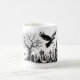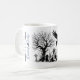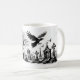 Eine geheimnisvolle Schwarz-Weiß-Abbildung eines Friedhofs in der Nacht. Ein großer Rabe stürzt über ein Feld von Grabsteinen und Kreuzen und seine Flügel überdehnten sich in einer bedrohlichen Pose aus. In der Nähe steht ein unfruchtbarer Baum, der lange, unheilvolle Schatten spendet. Die Szene ist voll von einem Gefühl der Finsternis, des Todes und des Übernatürlichen.