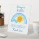 Niedlicher als das niedliche "Windeln-Raffle"-Design mit einer unterhaltsamen kleinen Cartoon-Sonne mit einer blauen Sonnenbrille, die unter seinem lächelnden Gesicht liegt, und rosigen Wangen. Die Sonne ist von einem schönen, dreistufigen Herdenregenbogen in Blautönen umgeben. Skripttext ist nicht editierbar (außer durch Designer) — kann gelöscht, aber nicht geändert werden. Composite Design von Holiday Hearts Designs.