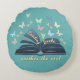 Celebrate your love for literature with this charming round decorative pillow. Featuring a whimsical design of an open book with graceful butterflies taking flight from its pages, on a peaceful light teal background, it beautifully illustrates the escape and transformation found in every story.