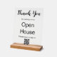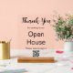Vielen Dank, dass Sie zu unserem Open House gekommen sind. Bitte scannen, um sich anzumelden. Dies sind die Wörter, die derzeit über dem QR-Codebild angezeigt werden. Sie können den schwarzen Bildschirmtext bearbeiten, um eine benutzerdefinierte Meldung anzuzeigen, falls gewünscht. Die oberste Zeile ist ein elegantes Skript, das Dankeschön sagt. Die Erholung des Textes ist kein Skript. Ein QR-Code befindet sich ganz unten, damit Ihre Gäste sich einscannen können. Denken Sie daran, Ihre Website einzugeben, damit der QR-Code korrekt funktioniert.