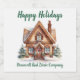 Dieses niedliche Weihnachtssekt-Label hat Ihren personalisierten Firmennamen und Happy Holidays in schick grüner Typografie sowie ein schönes Bild eines Hauses im Winter umgeben von Kiefern. Berufliche Feriengeschenke für echtes Anwesen Business Marketing.