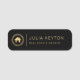 Dieses echte Anwesen-Namensschild zeigt ein goldfarbenes Imitat-Hauslogo, gerahmt durch ein kreisförmiges griechisches Schlüsselmotiv auf dem links und schlichten, goldfarbenen Sans Serif-Text auf der rechten Seite, mit einer vertikalen Linie dazwischen auf schwarzem Hintergrund.