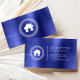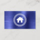 Diese echte Anwesen-Visitenkarte weist ein weiße Hauslogo auf, gerahmt durch ein kreisförmiges griechisches Schlüsselmotiv auf dem links und schlichten, weißen Sans Serif-Text auf der rechten Seite, mit einer vertikalen Linie zwischen einem saphir blauen, gebürsteten Metallhintergrund. Eine größere Version des Hauslogos erscheint auf der Rückseite.