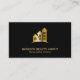 Berufliches Design der Visitenkarte mit einer goldenen Grafik von drei Häusern, die einen Aufwärtspfeil auf schwarzem Hintergrund bilden, ideal für echte Anwesen-Agent, Immobilienmanager oder Zuhause-Investment-Unternehmen. Der Aufwärtspfeil symbolisiert Wachstum, Erfolg, Investitionen und das Vertrauen in Immobiliendienstleistungen. Vollständig anpassbar mit Ihrem Namen, Kontaktdaten und Branding. Ideal für einen starken ersten Eindruck in der Wohnungswirtschaft.