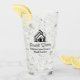 This professional realtor glass is custom made with your real estate company name under the modern cursive script for an open house. This trendy minimalist white and black realty business gift features a house logo image for home builder or realty agent company marketing.