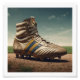 Wall Art & Décor: Ein verwitterter, Vintager Fußballschuh mit abgenutzter Lederoberfläche und subtiler Real Madrid-Markendarstellung vor minimalistischem Hintergrund.