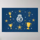 Wall Art: Ein Design, das die Geschichte des Real Madrid widerspiegelt, indem es kleine Ikonen zeigt, die große Meisterschaften darstellen. Goldene Trophäen und Sterne verteilen sich auf einen raffinierten, blauen Hintergrund, wobei das Logo dezent zentriert ist