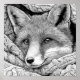 A challenging, densely detailed coloring page focusing on texture. Features Flicker the Fox peering out of a heavily cable-knit stocking. The line work emphasizes the realistic texture of the wool and the fox's fur, perfect for highly detailed coloring or embroidery patterns.