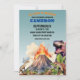 Diese individuelle Geburtstagsfeier bietet ein prähistorisches Thema mit realistischen Dinosaurier-Illustrationen. Ein Bild eines explodierenden Vulkans wird unten abgebildet, drei Dinosaurier sind vor ihm umhergezogen. Ein beängstigender, wütender Tyrannosaurus-Rex wird von hinten aus gesehen.