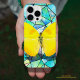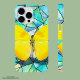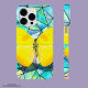 Lebhafter, realistischer Neon hellgelber Schmetterling fliegt über das farbenfrohe geometrische Glas in blauem Farbverlauf.