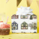 Echter Anwesen Agent Weihnachtsgeschenk-Wrap oder Büro Party-Dekoration mit Reihen von Ferienhäusern, einschließlich ein Lebkuchenhaus, für Weihnachten dekoriert.