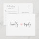 Diese einfache und elegante Hochzeitsmahlzeit-UAWG-Postkarte wurde entworfen, um sich mit unserer modernen Rebecca Hochzeitskollektion abzustimmen. Sie zeichnet sich durch ein süßes, wenig rosa Herz (die Herzfarbe kann geändert werden!) und handgeschriebenes, dunkelgraues Kalligraphie-Set vor einem sauberen, weißen Hintergrund aus. Anpassen Sie einfach Ihr Wunschdatum, akzeptieren und ablehnen Sie den Wortlaut, wählen Sie das Essen oder wählen Sie aus. Die Farben können auch an Ihr Thema angepasst werden. Vergewissern Sie sich, dass Sie die anderen Produkte dieser Kollektion durchstöbern, um ein abgestimmtes, stilvolles Aussehen für Ihren besonderen Tag zu schaffen. Wenn Sie Hilfe bei der Anpassung Ihrer Artikel benötigen, kontaktieren Sie mich bitte unter admin@albamarie.com. Ich helfe Ihnen gerne!