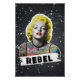 Striking pop-art portrait of an iconic Hollywood muse: grayscale skin tones with electric yellow hair, glossy red lips, and a graffiti-collage dress. Set against a splattered charcoal backdrop with a bold REBEL stencil, it blends vintage glamour with street-art attitude for a head-turning statement piece.