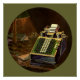 Vintages Illustrations-Business Finance-Design mit einem Computer. Ein altmodischer Buchhaltungsautomat oder eine antike Additionsmaschine im Büro eines Buchhalters auf einem Schreibtisch. Enthält ein Papierband zum behalt der Rechenkalkulationen.