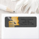 Adressetikett mit Goldpapier, Bleistift und Taschenrechner auf kohlegrauem Hintergrund.