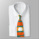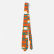 Diese Krawatte hat ein modernes Design von orangefarbenen Rechtecken mit weißen und goldenen Kreisen in ihnen und aquamarinen horizontalen Linien, die sie auf einem aquamarinen Feld überqueren.