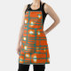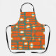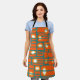 Diese Schürze hat ein modernes Design von orangefarbenen Rechtecken mit weißen und goldenen Kreisen in ihnen und aquamarinen horizontalen Linien, die sie auf einem aquamarinen Feld überqueren.
