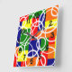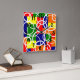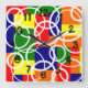 Diese Wanduhr ist ein Bauhaus-Design aus Rechtecken in rot, blau, orange, grün und gelb mit weißen Ringen, die oben verstreut sind.