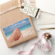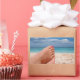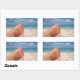 Rechteckiger Aufkleber mit Frauenfüßen mit rosa Nagellack auf einem weißen Strand auf einer Insel im Mittelmeer, der sich während der Sommerferien entspannt.