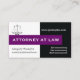 Rechtsanwalt lila, schwarze Visitenkarte mit silbergrauer Justizskala mit metallischem Effekt auf weißem, schwarzem Hintergrund und lila Band mit dem Text "ATTORNEY AT LAW". Eine großartige berufliche Visitenkarte für Rasenmäher, Rechtsberater, Anwaltskanzleien etc. Einige Elemente mit freundlicher Genehmigung von vectorportal.com.