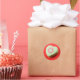 Fotografie eines minzgrünen Süßes mit einem roten recycle-Symbol auf einem roten Hintergrund.