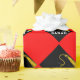 Creative Abschluss Geschenkpackung und Party Dekoration mit einem schwarzen Mütze mit einem goldenen Tassel auf rotem Hintergrund. So personalisieren Sie die Textbearbeitung, um den Namen Ihres bevorzugten Absolventen der Oberschule oder Uni hinzuzufügen.