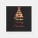 Eine rote und goldene Weihnachtsbaum-Serviette auf schwarzem Hintergrund.