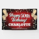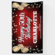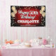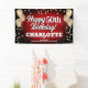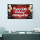 Ein lustiges Bannerzeichen für innen oder außen mit festlich silberfarbenen Metallballons auf beiden Seiten des Designs mit funkelnd, goldenen Metallkonfetti auf einem reich strukturierten, roten Hintergrund für Ihr personalisiertes Geburtstagsbanner. Dieses Produkt verdoppelt sich als wunderbarer Meilenstein-Geburtstagssicheres.