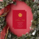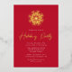 Moderne Fest-Einladungen mit einer goldenen Schneeflocke aus Goldfolie, ganz oben im Design mit festlichem rotem Hintergrund. "Holiday Party" wird in einem handgeschriebenen Goldfolienskript angezeigt. Personalisieren Sie die Einladungen zu den Schneeflocken mit Ihren Party-Details in weißer Schrift.