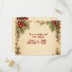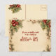 Eine schöne Hochzeitseinladung in Postkartenform. Ein fröhlicher, cremiger Hintergrund mit einem Rahmen aus Poinsettia mit rotem Text. Zurück ist cremig mit rotem Text und einem blüh von Heiligen und Poinsettia