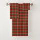 Red and green plaid towels hanging on a silver rod, showcasing a warm and festive design. Below, a matching washcloth is displayed with a corner folded.
