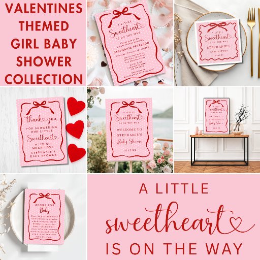 Create any baby shower signage you need with this editable poster template. In red and pink color palette with retro, coquette polka dots and bows. Perfect for a Valentines Baby Shower, "A Little Sweetheart Is On The Way" Baby Shower theme or February baby sprinkles.