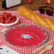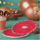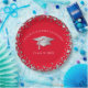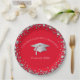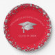This modern design features a graduation hat and confetti in silver on a background of red with white text.