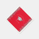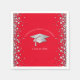 This modern design features a graduation hat and confetti in silver on a background of red with white text.