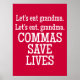 Dekorieren Sie Ihr Klassenzimmer mit diesem kühnen, stilvollen, lustigen und beliebten Poster. Dies ist das perfekte Geschenk für Lehrer, vor allem Englisch und Grammatik Lehrer. Es würde fantastisch aussehen, wenn es in einem Klassenzimmer oder einem Schulbüro angezeigt würde. Dieses Poster zeigt fett weißen Text auf einem soliden roten Hintergrund. Der Text lautet: "Lass’s Eat Oma. Lass's Eat, Oma. COMMAS RETTE LEBEN". Dieses Poster ist in verschiedenen Papiertypen und in verschiedenen Größen erhältlich, um Ihre eigenen Bedürfnisse Anzug. Nicht Lehrer? Wie bereits gesagt, dieses Plakat würde ein fabelhaftes Geschenk für den Lehrer Ihres Kindes, für Ihre Freunde, die Lehrer sind, neue Lehrer, etc. machen! Zazzle Plakate sind von hervorragender Qualität, daher weiß ich, dass Sie mit Ihrem Kauf zufrieden sein werden. Zeichnen Sie das Poster so, dass es noch schöner aussieht, während es angezeigt wird. Sie können dieses Produkt mit Ihren Freunden in den sozialen Medien teilen. Bitte senden Sie mir per Zazzle eine Nachricht, wenn Sie Fragen oder Bedenken bezüglich des Designs dieses Produktes haben.