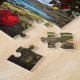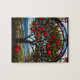 Gestaltetes Glas eines Apfelbaumes mit roten Äpfeln. Ein roter Apfel ist am Baumstamm auf dem Boden. Der Hintergrund hat grüne Abfahrten in Richtung eines blauen Flusses. Im Hintergrund gibt es auch blaue Berge. KI erzeugt.